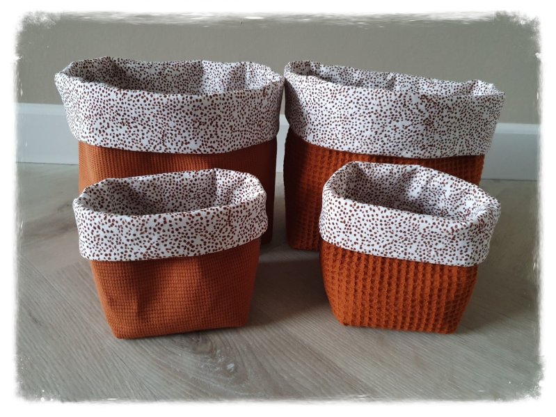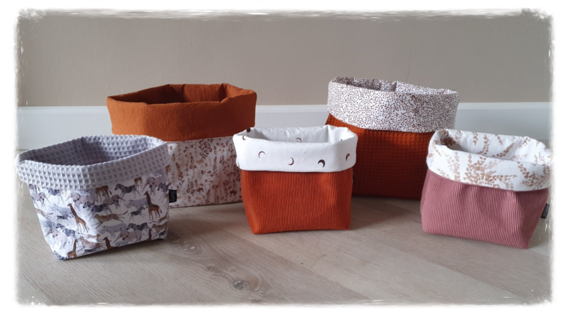 De mandjes hebben twee verschillende stoffen en kunnen aan beide kanten gebruikt worden.